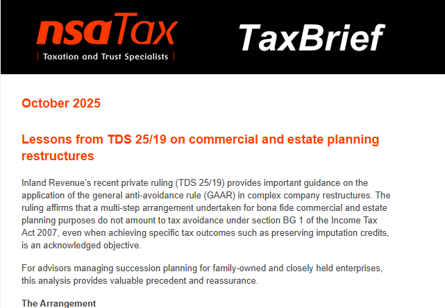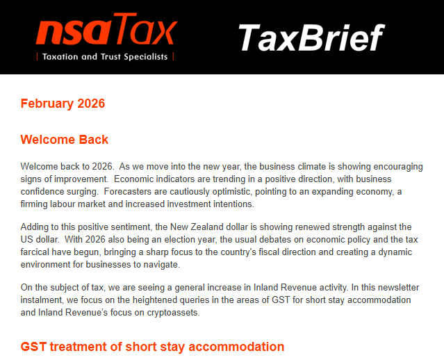 February 2026 Welcome back GST treatment of short stay accommodation Income tax treatment of cryptoassets Buying and sellling accounting fees December 2025 Christmas/New Years hours Consultation on taxation of company loans to shareholders Inland Revenue audit activity: 2025 year in review October 2025 Lessons from TDS 25/19 on commercial and estate planning restructures FBT treatment of open loop cards Introducing Serjit “Serj” Singh February 2024 Trust Tax Rate Increase Residential Rental Properties: Interest Deductions and Bright-line Individual Tax Rates Family Boost Tax Depreciation on Commercial Buildings July 2023 Trustee Tax Rate Increase Backdated Lump Sum Payments Bright-line Main Home Exclusion GST & Dwellings – The final Chapter? December 2022 Christmas/New Year Hours Interest Rates Increased Variation to Trust Reporting Requirements Profit-Making Scheme? Taxable Activity? November 2022 Bright-line Rollover Relief GST Inputs for First Time Developers GST Principal Purpose Test Revival August 2022 Trust Disclosure Rules Bright-line Test Rollover Relief – Room for Improvement The Complexities of Interest Deductibility & Residential Rentals GST Input Tax Changes Enacted December 2021 Christmas/New Year Hours Extension of Reporting Requirements for Domestic Trusts A Bright-line Test Lasting More Than 10 Years? October 2021 Taxation (Annual for 2021–22, GST, and Remedial Matters) Bill & Supplementary Order Paper High Wealth Individuals: Data Gathering Project July 2021 Purchase Price Allocation Rules Business Continuity Test Interest Limitation Rules Bright-line Test March 2021 Carry Forward of Tax Losses: Business Continuity Test 39% Tax Rate: The Clock is Ticking End of Year Tax Planning Bright-line Rules December 2020 Christmas/New Year Hours IS 20/05 – Supplies of Residences and Other Real Property Tax Bill Gives New Powers to IRD November 2020 IRD Targets Bright-Line Sales Some FAP Payments are Subject to GST Small Business Cashflow Loan Scheme & Operating Lease Term Extension September 2020 Labour’s Tax Policy: Politically Astute or Slow Learners? Commencement of Liquidation for Tax Purposes August 2020 Resurgence Wage Subsidy GST & Deregistration Tax Planning for US Citizens Moving to New Zealand One Chance To Get It Right June 2020 How does the Trusts Act 2019 Affect my Trust? New Tax Bill Introduced IRD Interest & Penalties Bad Debts Wage Subsidy nsaTax Ltd – Update on Business as Usual nsaTax Ltd – Update on Business as Usual COVID-19 Tax Measures Temporary Loss Carry Back Scheme Remission of Use of Money Interest and Late Payment Penalties A Brief Note on the Wage Subsidy Scheme Covid-19: Office Closure Covid-19: Office Closure COVID -19 Stimulus Package COVID -19 Stimulus Package February 2020 BEPS Disclosures – Does BEPS Impact on Your Clients? GST & Airbnb The Next Wave of AEOI Letters Being Issued (Reprint) December 2019 Christmas/New Year Hours Who is a Settlor – Trust Update R&D Tax Credit The Next Wave of AEOI Letters Being Issued September 2019 Permanent Place of Abode Revisited? Trust Law Changes GST on Low-Value Goods Imported from 1 December 2019 Valuations May 2019 UK Pension Transfers Update: Ring-fencing of Residential Rental Losses Cullen Group, NRWT & AIL Leaky Buildings: A soggy mess Valuations February 2019 Happy New Year! Capital Gains Tax: The Final Word? Ring-fencing Residential Rental Deductions Lock out of First Home Buyers – Lying with Statistics December 2018 Christmas/New Year Hours New Threshold for Amending Assessments Dividend Stripping Capital Gains Tax October 2018 We’re here to help Tax Working Group Own a Bach? June 2018 GST Warranties in S&P Agreements Ring-fencing of Residential Rental Losses Leaky Buildings – The Conundrum March 2018 Provisional Tax and Use of Money Interest Changes Year End – March Reminders LTC Quirks Inland Revenue Unfettered? – A Green Light From CAANZ? December 2017 Bright-line Test Gone Wrong Bob the Builder 2017 in Review Christmas/New Year Hours November 2017 Tax is Easy – Yeah Right! Cash Economy & Voluntary Disclosures August 2017 IRD Property Compliance & Audit Activity Changes to UOMI & Incremental Late Payment Penalties June 2017 Debt Forgiveness Within an Economic Group – What’s Changed? New Rules for Labour Hire Firms and Contractors – Big Brother is Watching! Budget 2017 Budget 2017 – Business as Usual for Taxpayers May 2017 Bright-Line and RLWT Webinar Issues RLWT – Calculation Now More Complex Staff Changes